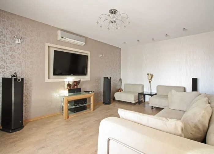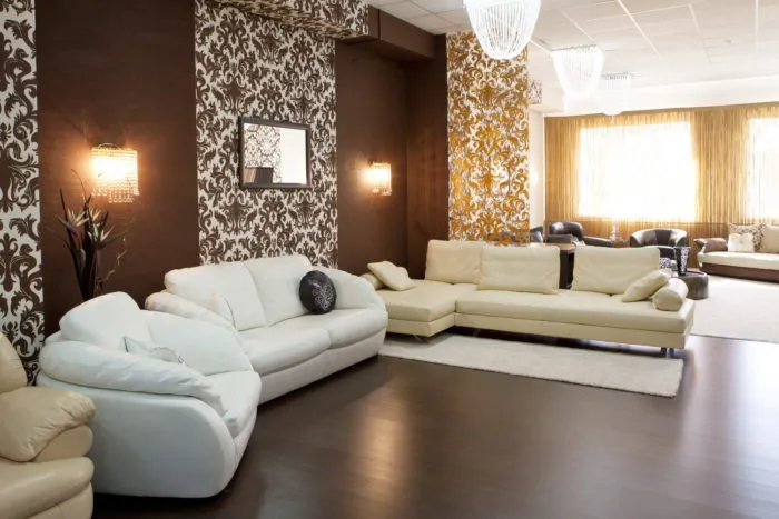 Если зал маленький, то стоит подбирать светлые оттенки. Это оптический обман увеличит пространство и сделает его более просторным. Фотообои не рекомендуется применять в таких комнатах, так как они утяжелят восприятие. Желательно выбирать настенные покрытия однотонные или текстурные с некрупным орнаментом.