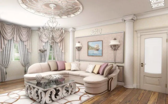 Второй вид позволяет благодаря плавным переходам совместить различные по фактуре настенные покрытия. Выполненный в светлых тонах такой дизайн гостиной соответствует классическому стилю.