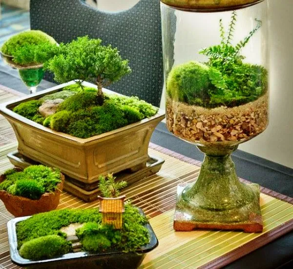 Мхами украшают растущие в кадках деревца бонсай, но при посадке мха в кадку нужно следить, чтобы не вся поверхность субстрата была покрыта мхом, в противном случае к дереву будет ограничен доступ воздуха.
