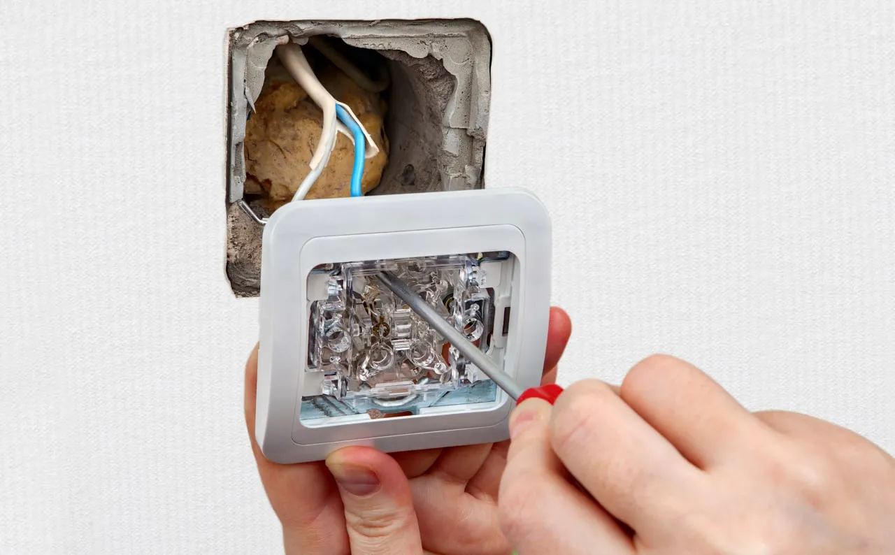 - Выкрутите шурупы, фиксирующие выключатель на стене. Достаньте его из подрозетника. Открутите шурупы, которыми зажаты провода, и освободите их.