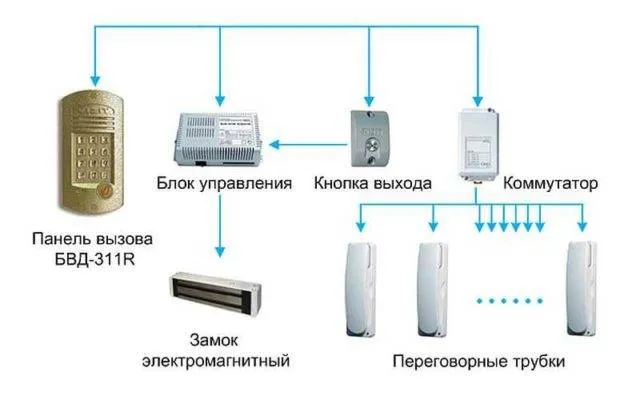 В многоэтажках домофон имеет намного более сложную структуру. В его составе кроме вызывного устройства имеется коммутатор и считыватель ключей (нужен когда замок открывается снаружи одним из жильцов). Еще данная система имеет большое количество трубок, сигналы от которых должен принимать и обрабатывать коммутатор. Он же должен идентифицировать сигнал, набранный с вызывного устройства и подключать нужную трубку.