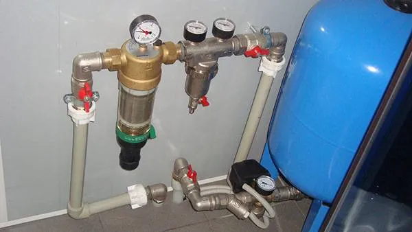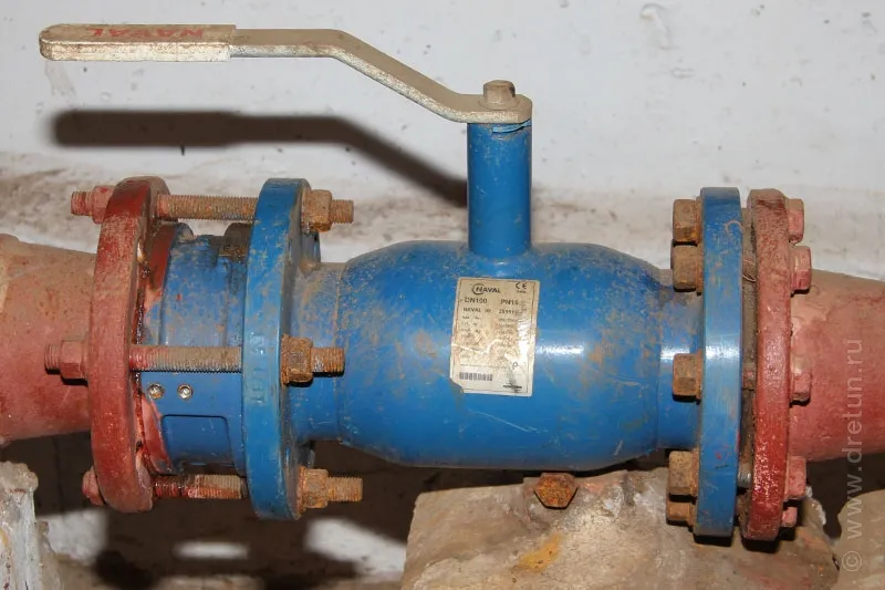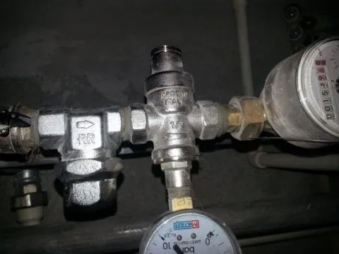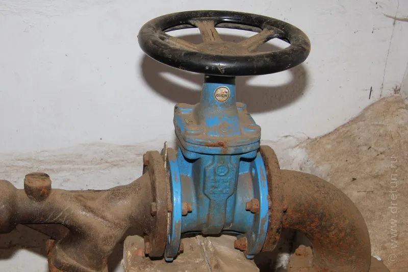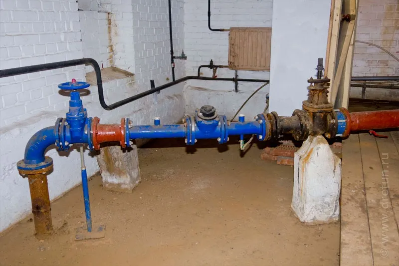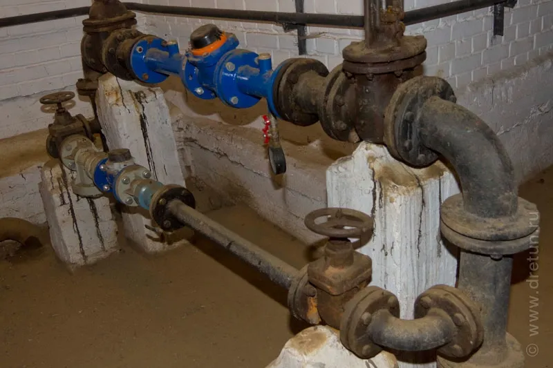 Местная насосная станция подаёт воду в магистраль из сети водоканала. Большая подающая труба входит в дом и заканчивается задвижкой, после которой идёт водомерный узел.
