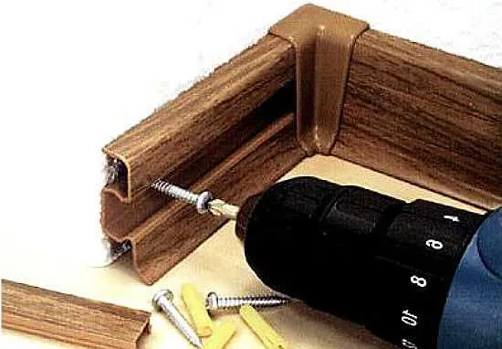 1. Берем внутренний угол, к нему приставляем цельный плинтус с длинной стороны стены, снимаем кабель-канал. С помощью шила намечаем место крепления к стене около угла, убираем плинтус, высверливаем отверстие в стене, забиваем дюбель, ставим обратно плинтус, сажаем на саморез (контрольный). Затем с шагом 500 мм (последний у противоположного конца) также намечаем место крепления к стене. Там где плинтус отходит от стены, шаг между креплением уменьшаем.