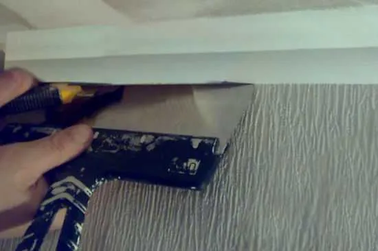 Демонтаж потолочного плинтуса начинается с расчистки ножом краски по сторонам багета. Далее между стеной и плинтусом вбивают острый конец зубила, или шпателя, отделяя изделие по всему периметру комнаты.